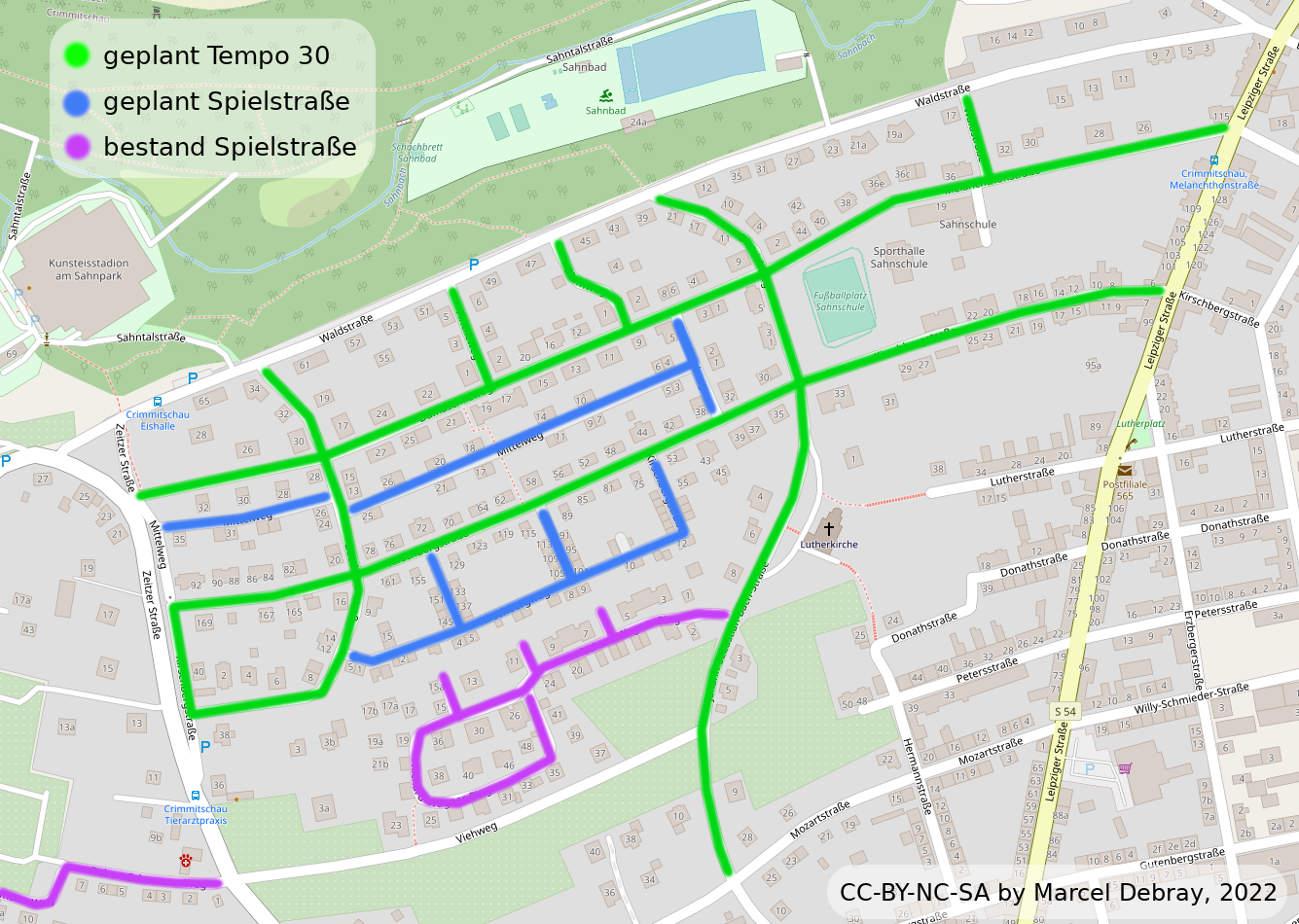 Wir regen an den Verkehr generell durch verschiedene Maßnahmen zu beruhigen. Es sollte eine Temp-30 Zone auf den folgenden Straßen entstehen: