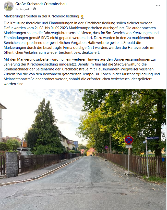 An den zum Parken freigegebenen Straßenseiten in der Kirschbergsiedlung wurden in den Kreuzungsbereichen alle entsprechenden Sperrflächen zusätzlich markiert, um die schmalen Straßen auch bei hohem Parkverkehrsaufkommen mit Kraftfahrzeugen befahren zu können.